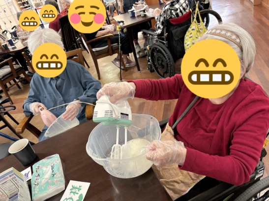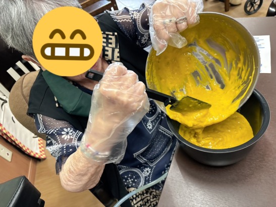 ご利用者様に生地をかき混ぜる作業などを取り組んでいただき、混ぜ終えた生地を炊飯器にスイッチを入れて出来上がりを待ちました!