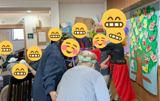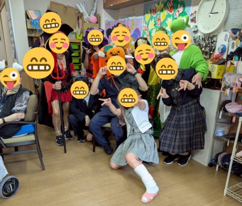 午後からいよいよハロウィンパーティー🎃職員も全員色々な仮装しました!ご利用者様にも参加していただき、昔懐かしい「だるまさんが転んだ!」をしました。思わず動いてしまい、鬼のところに連れて行かれてしまう様子に盛り上がっていました。さらに、仲間が鬼にタッチすると逃げて行けるというルールを追加することでさらに盛り上がりました。利用者様も普段以上に楽しそうにされており、とっても盛り上がりました!